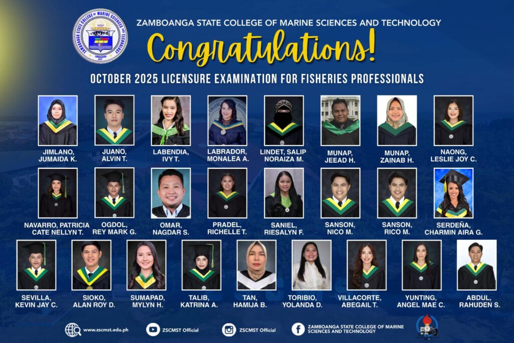 The Zamboanga State College of Marine Sciences and Technology (ZSCMST) congratulates the 𝟒𝟔 new Fisheries Professionals who successfully passed the October 2025 𝐋𝐢𝐜𝐞𝐧𝐬𝐮𝐫𝐞 𝐄𝐱𝐚𝐦𝐢𝐧𝐚𝐭𝐢𝐨𝐧 𝐟𝐨𝐫 𝐅𝐢𝐬𝐡𝐞𝐫𝐢𝐞𝐬 𝐏𝐫𝐨𝐟𝐞𝐬𝐬𝐢𝐨𝐧𝐚𝐥𝐬, which resulted to recognize ZSCMST as 𝐓𝐨𝐩 𝟔 𝐏𝐞𝐫𝐟𝐨𝐫𝐦𝐢𝐧𝐠 𝐒𝐜𝐡𝐨𝐨𝐥 in this examination!