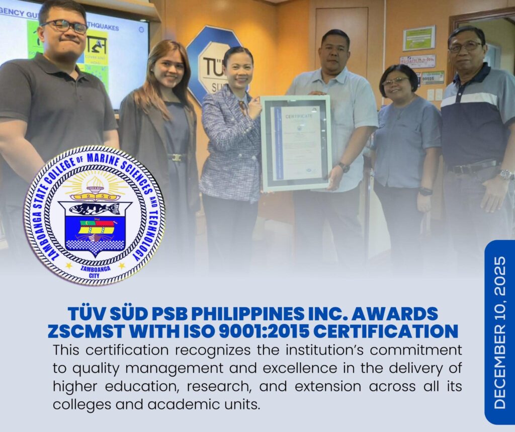 The Zamboanga State College of Marine Sciences and Technology (ZSCMST) has been awarded with ISO 9001:2015 Certification by TÜV SÜD PSB Philippines Inc. on December 10, 2025, in Pasig City.