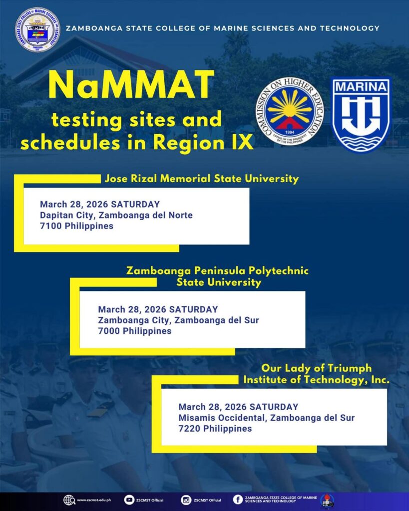Informing all aspiring maritime students, especially those who wish to enroll at Zamboanga State College of Marine Sciences and Technology (ZSCMST), that the 𝐍𝐚𝐌𝐌𝐀𝐓 (𝐍𝐚𝐭𝐢𝐨𝐧𝐚𝐥 𝐌𝐚𝐫𝐢𝐭𝐢𝐦𝐞 𝐌𝐚𝐧𝐩𝐨𝐰𝐞𝐫 𝐀𝐬𝐬𝐞𝐬𝐬𝐦𝐞𝐧𝐭 𝐓𝐞𝐬𝐭) will be conducted in the following testing sites in 𝐑𝐞𝐠𝐢𝐨𝐧 𝐈𝐗: