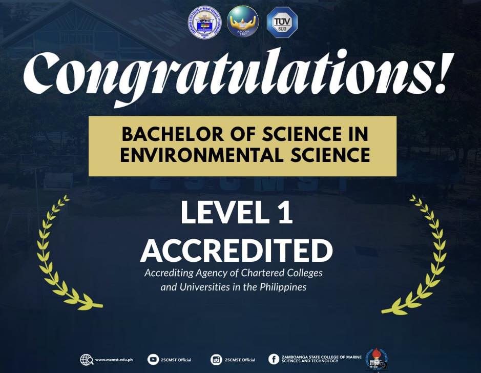 Following the September 22–26, 2025 Survey Visit of the Accrediting Agency of Chartered Colleges and Universities in the Philippines (AACCUP), ZSCMST is proud to share that the Bachelor of Science in Environmental Science has been awarded Level I Accredited Status, affirming its compliance with quality standards and readiness for continuing advancement.